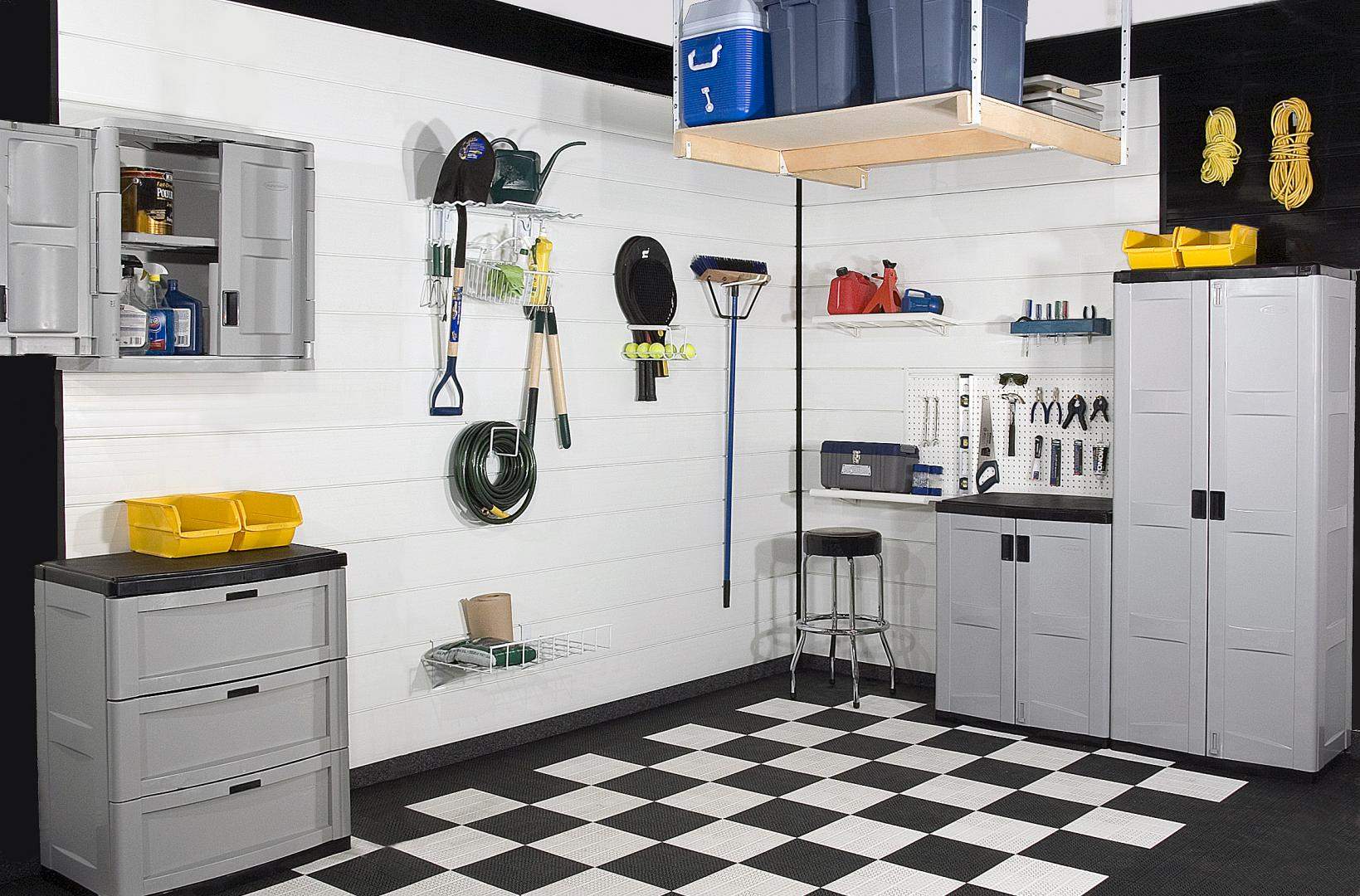 You can easily convert your existing garage walls into a stylish storage space to free up your garage floor space. Hang-up and organize your garden equipment, tools, sports gear, and just about everything else! Store your bulky items in a garage ceiling storage loft and cover your stained garage floor with a durable plastic garage floor tile that's strong enough to support your car, truck or SUV!