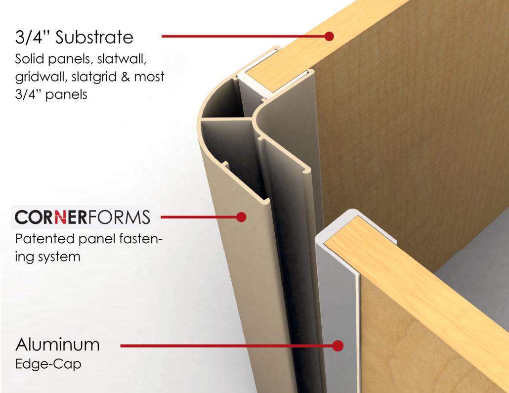 Cornerforms Modular Wall System is the patented two part fastening systems that can be used to construct perimeter walls, fitting room, floor fixtures, part time counters, trade show booth and hundreds of other construction applications. Cornerforms and its associated edge cap component naturally reinforces the panel. On site assembly is extremely simple. Cornerforms permits lasting assembly, no sliding is necessary.